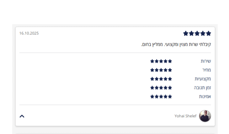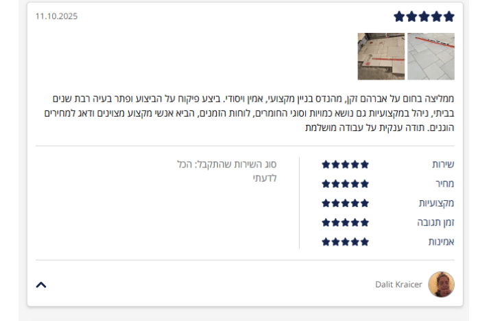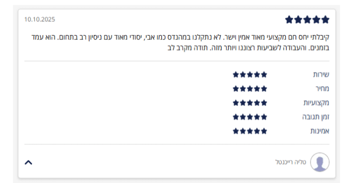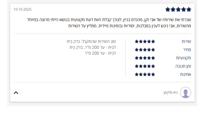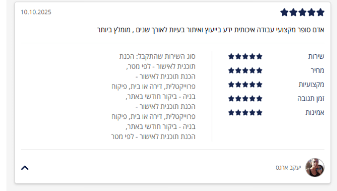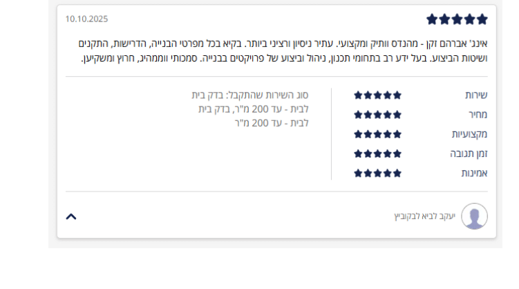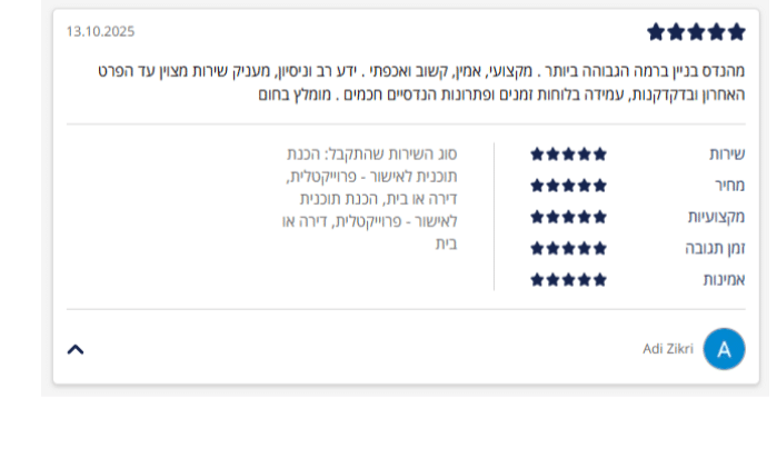 היכולת שלי לתכנן את תהליך הבנייה לפרטי פרטים, לזהות נקודות כשל וסיכון מבעוד מועד – ולפעול למניעתם, יוצרת תהליך בנייה נכון, בריא ויעיל המשפיע רבות על תקציב ומשך הפרויקט.